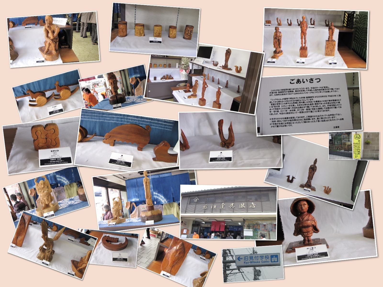今回の会場(旧)近江屋呉服店さんはご都合で昨年から呉服店としての営業は中止していたが、その店舗の商品棚を利用しての作品展示であった。通常は事前に現地チェックをしてから展示レイアウトを検討するのが常であったが今回はそれがなく、当日いきなりアドリブで展示レイアウトを決定するスタイルいわゆる『ノリ打ち』状態であった。