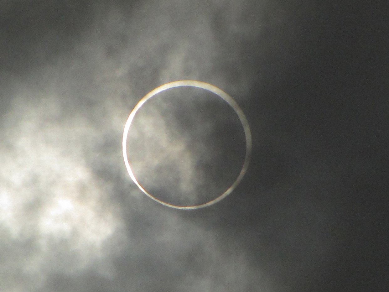 数年前にあった皆既日食時に用意した日食グラスが残っていたのでこれを使って雲の切れ間から何とか観察できていた日食であったが、なぜか食の最大の時間帯にだけ雲がすっぽりと日食を遮ってしまい全く見えなくなってしまった。この偶然のいたずらにガッカリしたがあきらめずにしばらく曇り空を眺めていたところ…雲の切れ間から一瞬、金環日食を覗くことができたので『パチリ』とシャッターを落した。