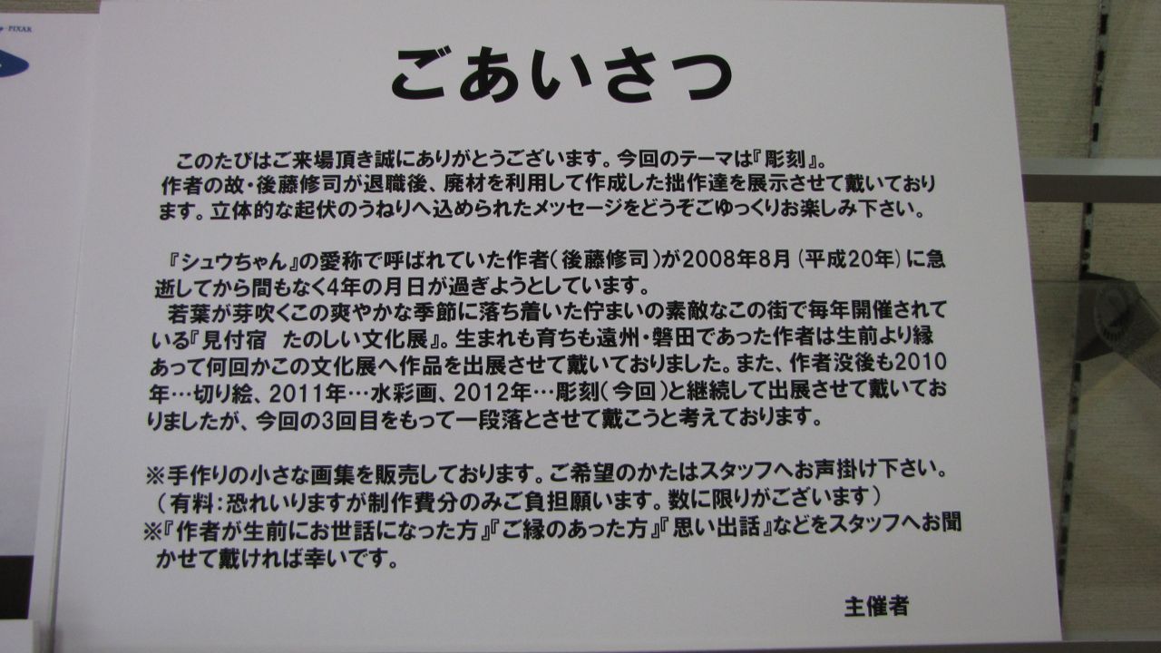 『見付宿たのしい文化展』への出展は後藤修司氏 没後 今年で3回目となったが、今回をもって一段落としようと考えている。(その他今後の展覧会も同様に一段落としようと考えています。今後の作品展示等の予定は一切未定)