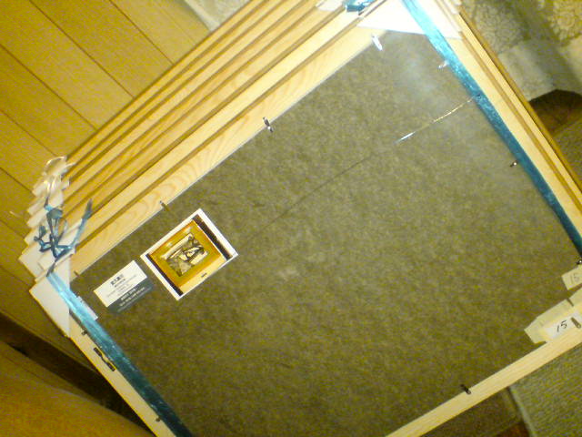 搬出は搬入のそれよりもはるかにシンプルである。天井からワイヤーで吊り下げられているピクチャーハンガーから額を外して、ガラス面を併せて二枚ずつペアにして、四隅をカバーする保護材(画用紙で出来た簡単なもの)といっしょに紐で縛りこのセットを複数作る。今回展示した作品は13点と奇数枚となるのでアトリエ(というか自宅)から余分に同サイズの額を持ち込んで対にして梱包を行った。